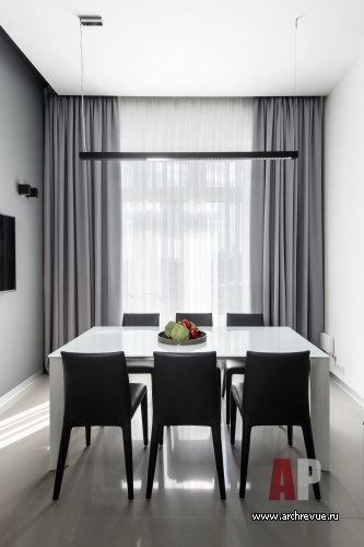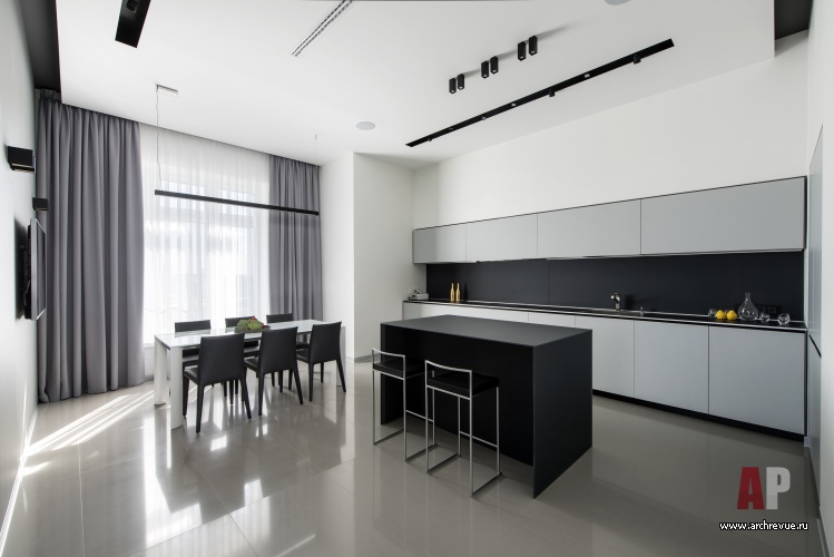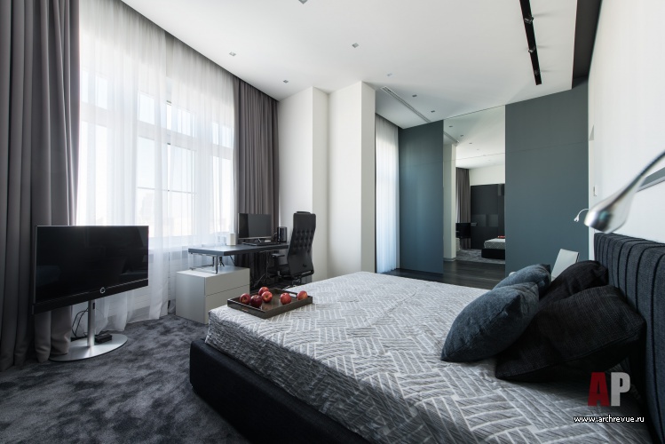 В колористике холодная сине-бело-серая гамма уравновешивается темным деревом и шторами цвета шоколада.