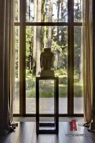 Создавая образ современного интерьера вне времени, декоратор сделала ставку на материалы двух типов: которые будут красиво стареть и те, что долго не выйдут из моды. Половая доска из мореного дуба, природный мрамор с живописной фактурой, сланец, травертин, оникс стали основой интерьера в духе благородной роскоши. Прототипом интерьера послужил миланский отель Bvlgari, поэтому основу меблировки составили предметы европейских производителей, но не остромодные, а спокойных благородных форм.