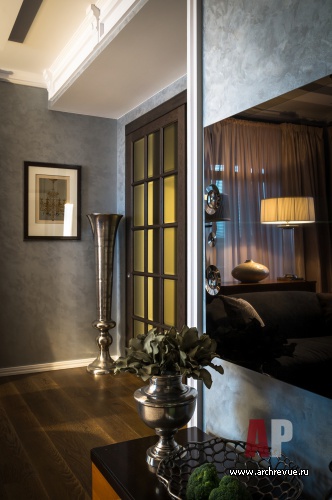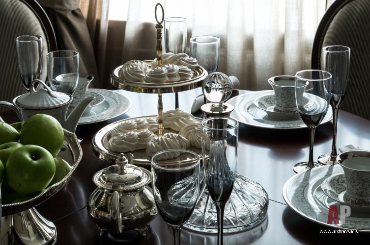 Строгости придает контрастность отделок и жесткая геометрия деталей. Графичность интерьера поддерживается авторскими деревянными изделиями, аксессуарами, гравюрами. Большая роль уделена световому решению, тому, как свет работает с текстурами интерьера, струится по стенам и тканям, создавая особый, мягкий эффект.