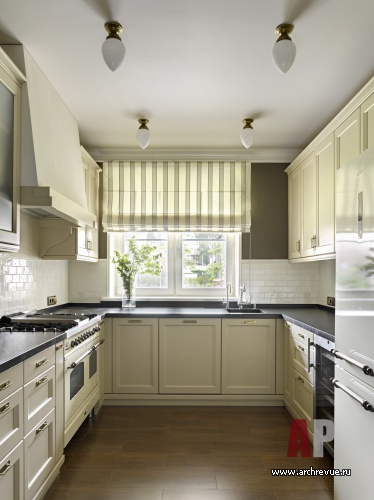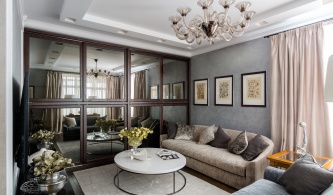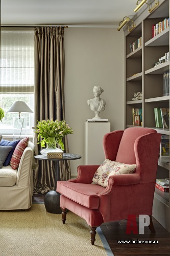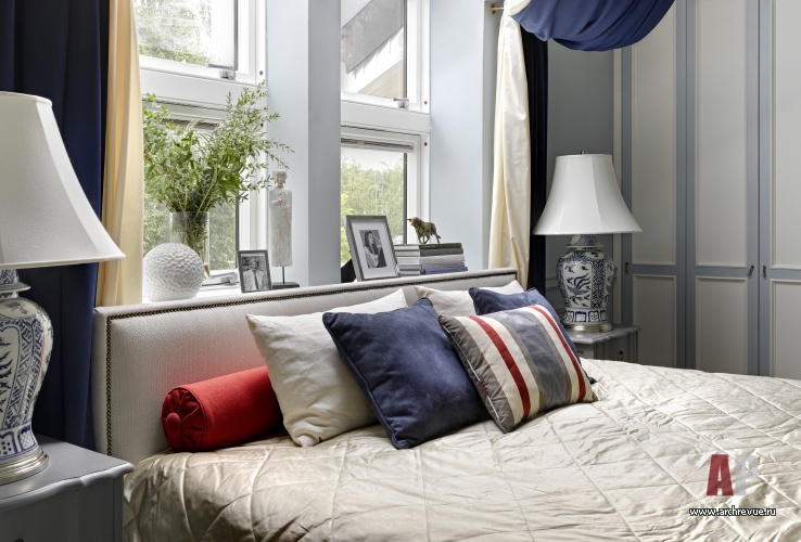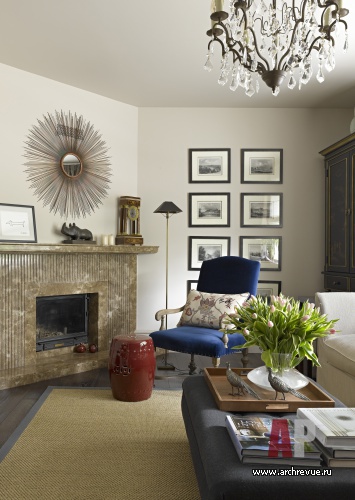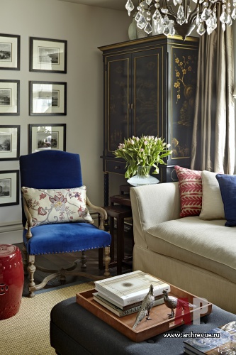 Едва ли не главную роль в этом эклектичном интерьере играет цвет. В качестве базовой гаммы были выбраны сложные оттенки интеллигентного серого: от пастельных (в гостиной и спальне) до насыщенного (в кабинете). Живости интерьеру добавила мебель и текстиль ярких, открытых тонов, их «впитали» стены и стали еще сложнее и благороднее. Экзотическую ноту в классический американский интерьер вносят предметы в стиле шинуазри: ручной работы шкаф в гостиной и комод в прихожей, которые были привезены из Китая.