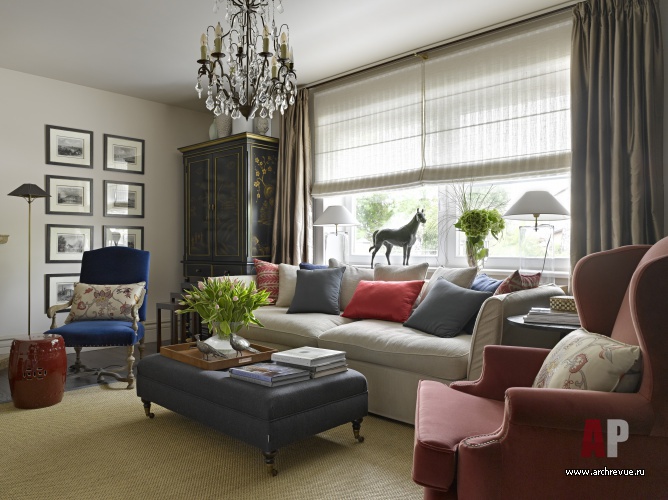 Гостиная кресло Eichholtz, обтянуто тканью Lelievre, керамический табурет Asiatides, диван, пуф Flamant