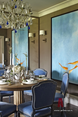 В доме нашлось место и для антиквариата, например старинных стульев в столовой, а также современной живописи – картин художника Валерия Песина, написанных специально для этого интерьера. Ряд изделий (практически вся встроенная мебель) был сделан на заказ по эскизам декораторов.