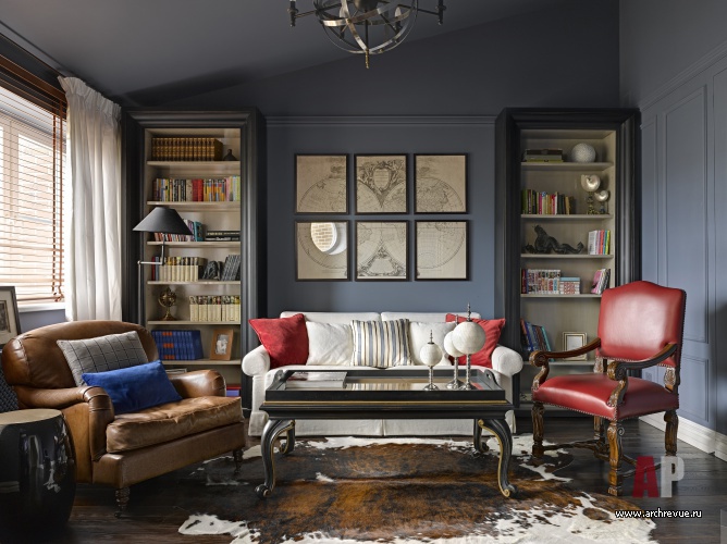 Кабинет кресло Eichholtz, книжные стеллажи Guadarte, журнальный стол Chelini, диван Asnaghi Interiors