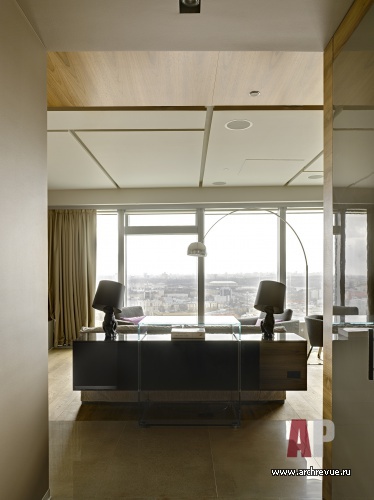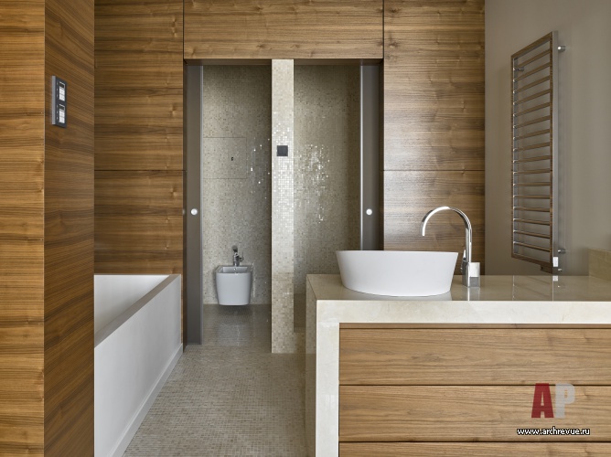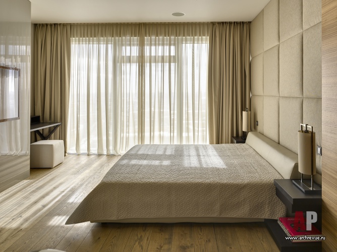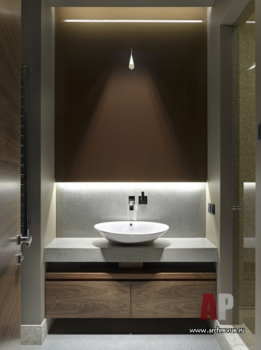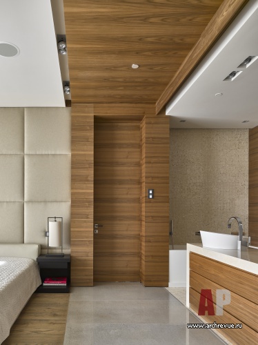 Вместе они образуют лаунж, оптимальный для отдыха, как в дружеской компании, так и в одиночестве. Огни большого города благодаря панорамным окнам становятся продолжением клубного интерьерного решения. От общественной части изолирована спальня. Она решена в едином пространстве с ванной комнатой: возможно, в семейном интерьере, такое решение и выглядит чересчур экстравагантно, но в случае с апартаментами на week end оно чрезвычайно удачно.