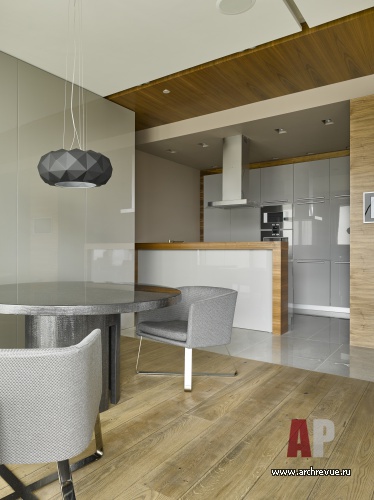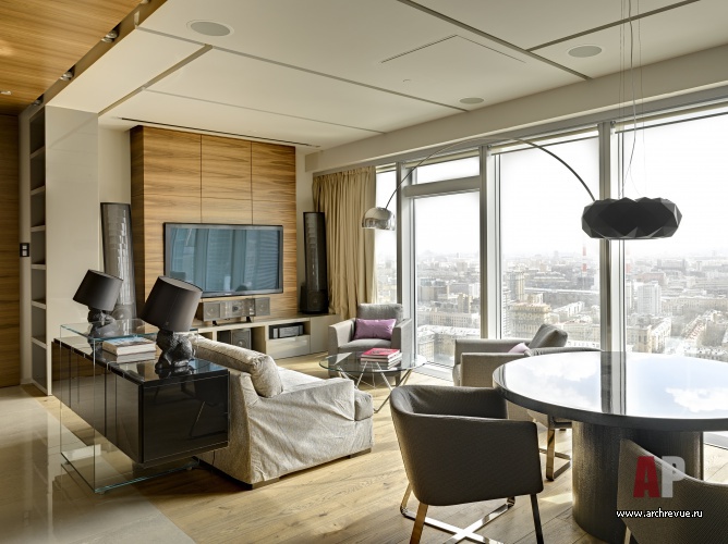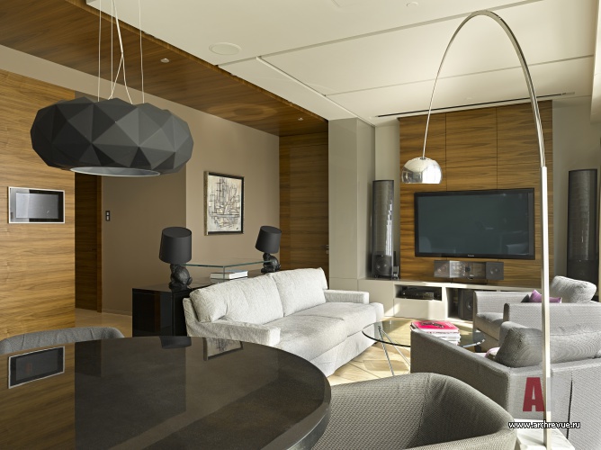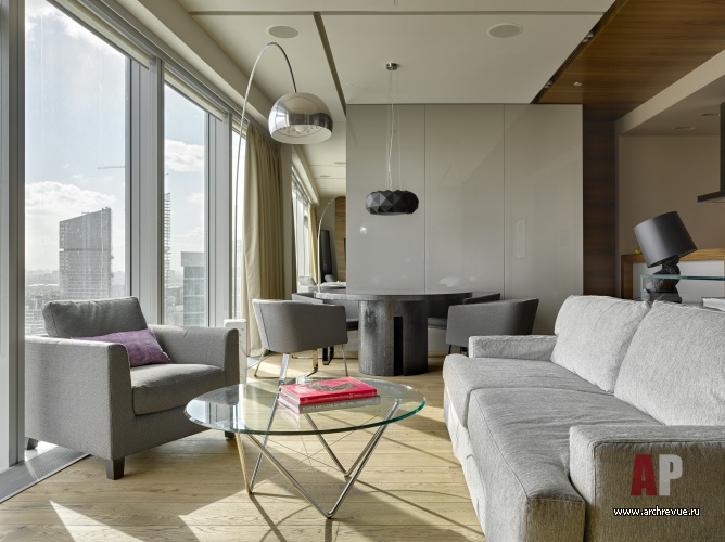 Интерьер квартиры выполнен в современном урбанистическом стиле со своеобразными дизайнерскими вольностями в виде авангардных светильников MOOOI. Квартира выдержана в почти монохромной гамме: теплый орех в сочетании с разнообразными оттенками серого – серый металлик, дымчато-серый, землисто-серый, серебристо-серый – они не перетягивают внимание от роскошной городской панорамы и, в отличи, от насыщенных цветов дают возможность расслабиться, успокоиться…