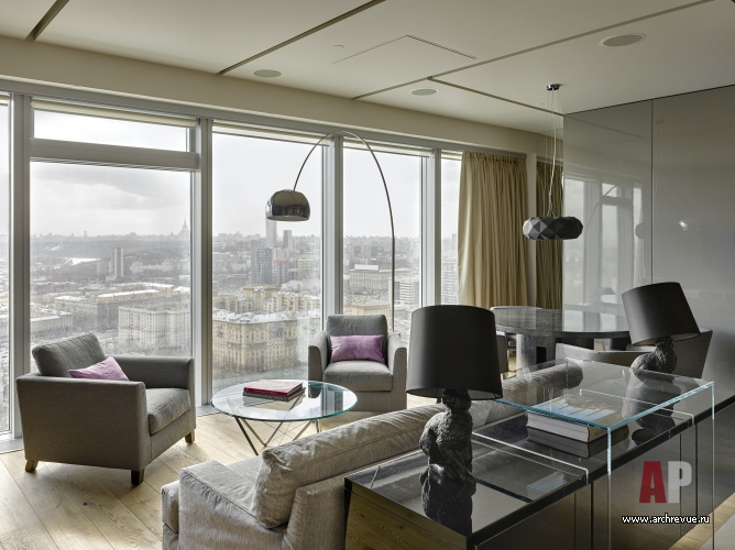 Задача, поставленная перед архитекторами, была одновременно и сложной, и чрезвычайно интересной. Для семейной пары следовало спроектировать урбанистическую квартиру выходного дня. Заказчики постоянно живут за городом и апартаменты в Москва-Сити изначально рассматривали как интерьер для временного проживания – отдохнуть после ресторана или театра, пригласить друзей на коктейль, задержаться в городе после работы…