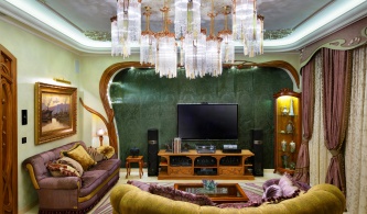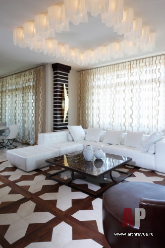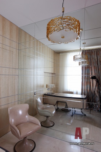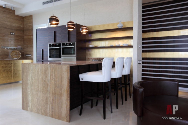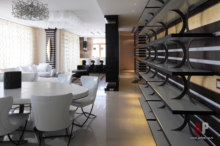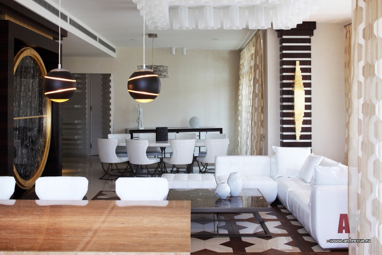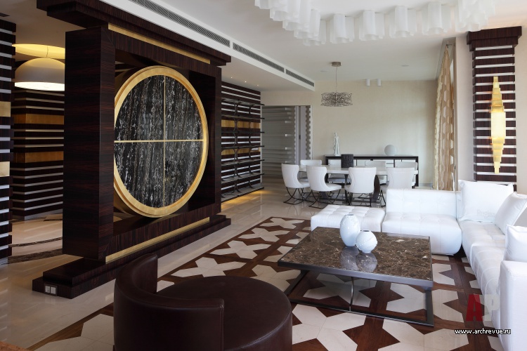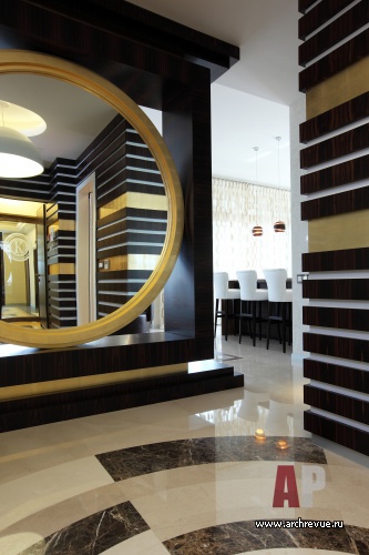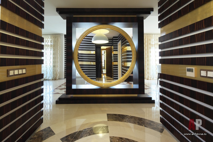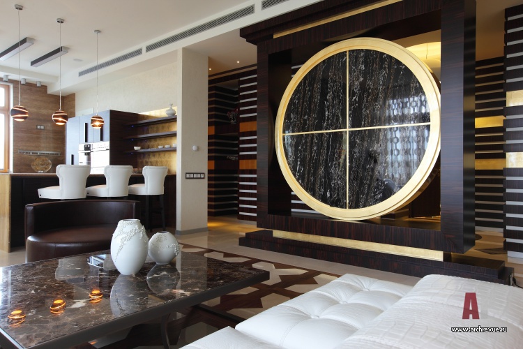 Основная декоративная идея проекта – круг, который многократно обыгран в интерьере. Самый яркий из них – перегородка между прихожей и гостиной: вертикальная круглая конструкция из дерева с каменными вставками и золочением, выполненная по индивидуальному проекту. Лакированные изделия из макасара, полированный камень, сусальное золото вносят в современный по сути интерьер роскошную ноту стиля ар-деко.