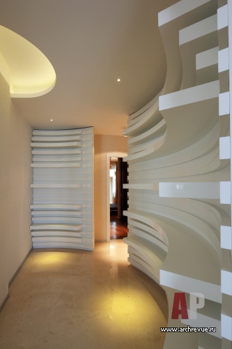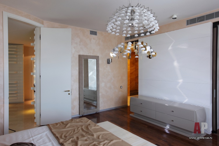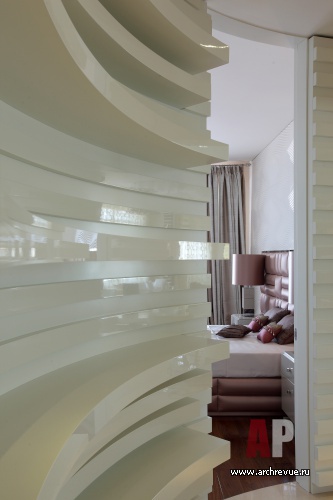 Хозяйские апартаменты включают в себя спальни со своими ванными комнатами и гардеробными. Их предваряет небольшой холл с изогнутой стеновой конструкцией, которая набрана из панелей, сложенных неровной стопкой. Благодаря столь рациональной планировке интерьер максимально удобен для жизни в ритме большого города.