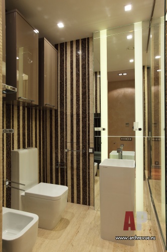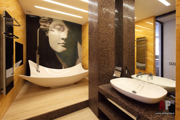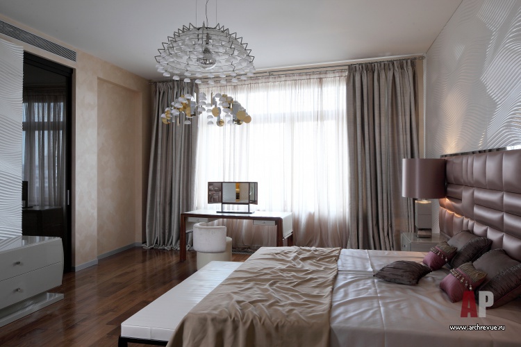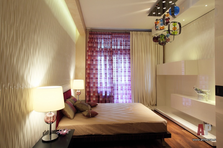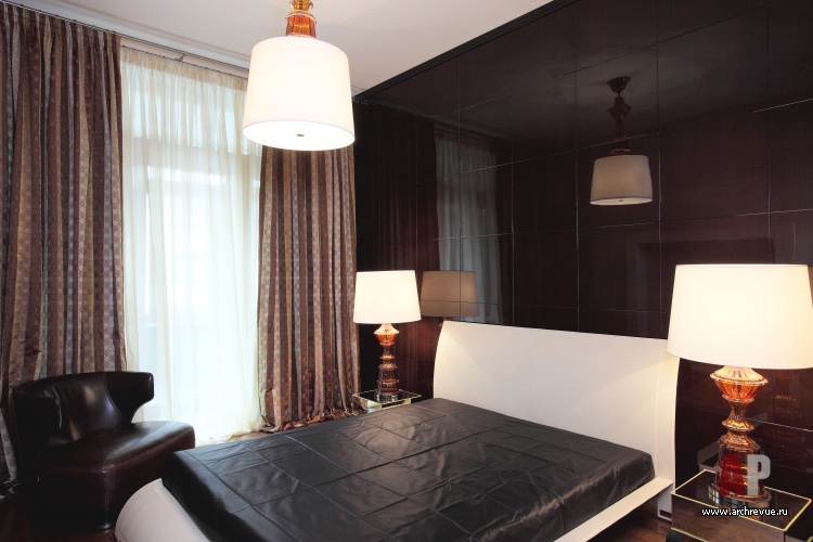 В спальнях изделия из макасара сменяют декоративные панели из лакированного венге и клена. Уникальные авторские решения вместе с ультрасовременными светильниками формируют яркий, образный интерьер.