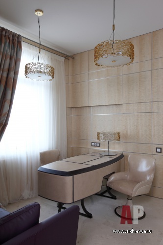 Кабинет письменный стол, рабочее кресло Baxter; стеновые панели со встроенными шкафами, индивидуальное изготовление, компания «АФ Ника»