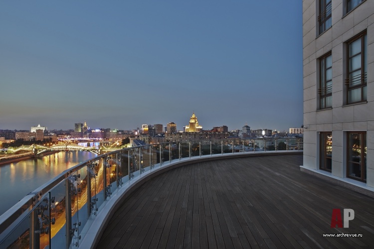 Остальное пространство заняла общественная часть и родительская территория: кухня, малая столовая, парадная столовая, совмещенная с гостиной и спальня хозяев с ванной комнатой. Еще одно преимущество квартиры – роскошная 150-ти метровая терраса, ограждения для которой выполнены из металла и прозрачного стекла по чертежам архитектора.