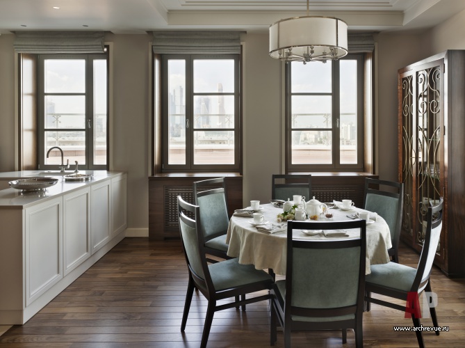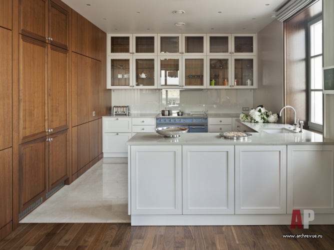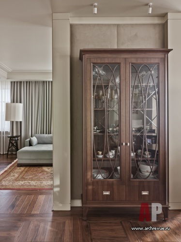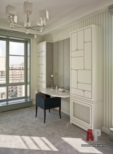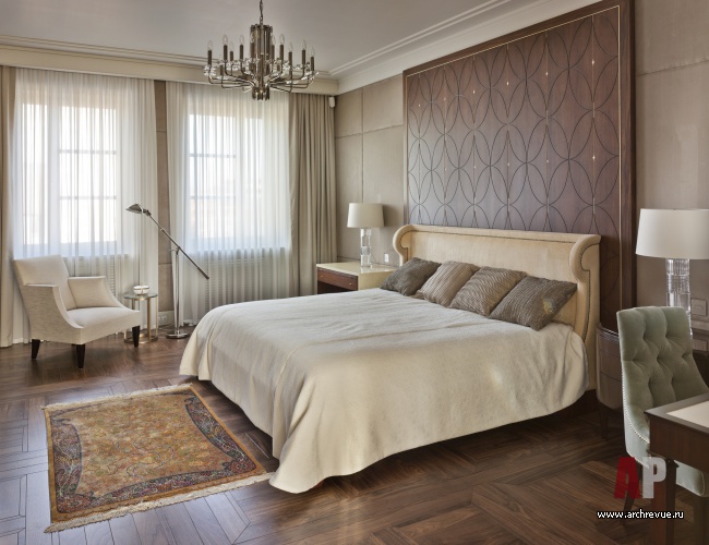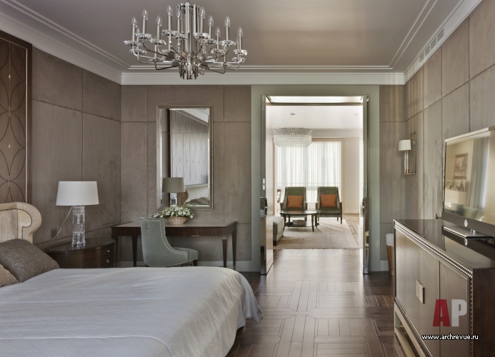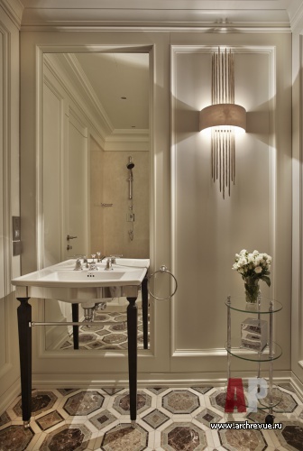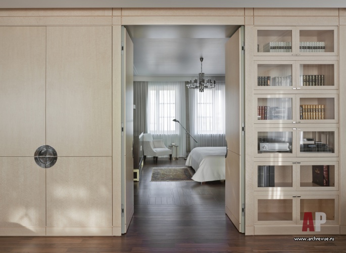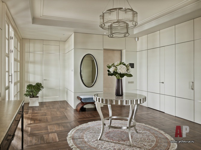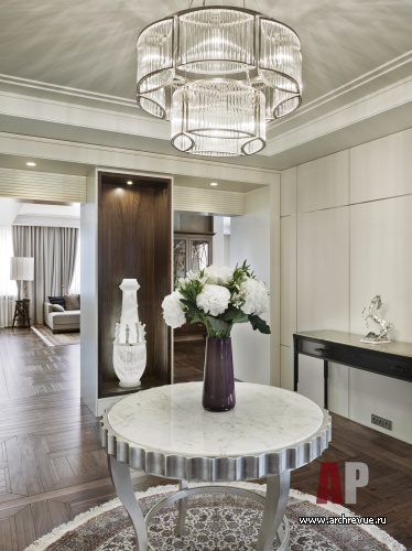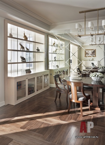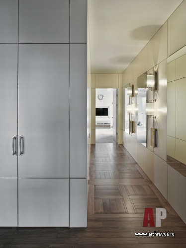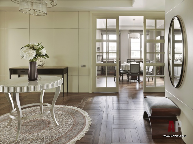 Выбранный масштаб, пропорции изделий, внимание к деталям – все формирует особую эстетику, где простота соединена с подлинным шиком. Важный декоративный ход – использование стеновых панелей, в которые встроены двери, порталы, шкафы. В их производстве используются материалы с редкими фактурами: панели из клена «птичий глаз», панели из ореха со вставками из металла, а также тканевые панели индивидуального производства. Щитовой паркет из ореха, рисунок которого также разработан архитектором, и отделка из мрамора четырех сортов завершают облик этого в высшей степени элегантного интерьера.