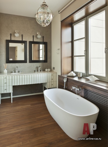 Характерная особенность интерьера – тщательная проработка деталей. Стеновые панели, порталы, встроенные шкафы, двери, изголовье кровати в хозяйской спальне, а также часть корпусной мебели было спроектировано архитектором в индивидуальном порядке и изготовлено на заказ. Интеллигентный вид интерьеру придают как пастельная палитра, построенная на цветовых нюансах и полутонах, так и изделия, выполненные в духе традиционных европейских и американских интерьеров.