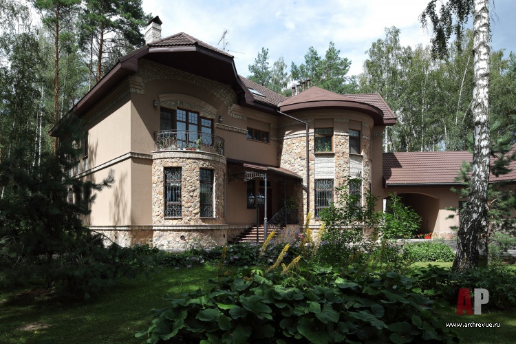 Заказчики, будучи приверженцами классики, поставили перед архитектором Ксенией Бобриковой задачу создать консервативный дом, в котором бы читались отсылки к викторианскому стилю, модерну и традиционной классике, а в оформлении мансарды присутствовали бы элементы кантри. Теплого, душевного, уютного. Двухэтажный каменный дом с мансардой размещен по центру треугольного в плане участка площадью 0,6 га.