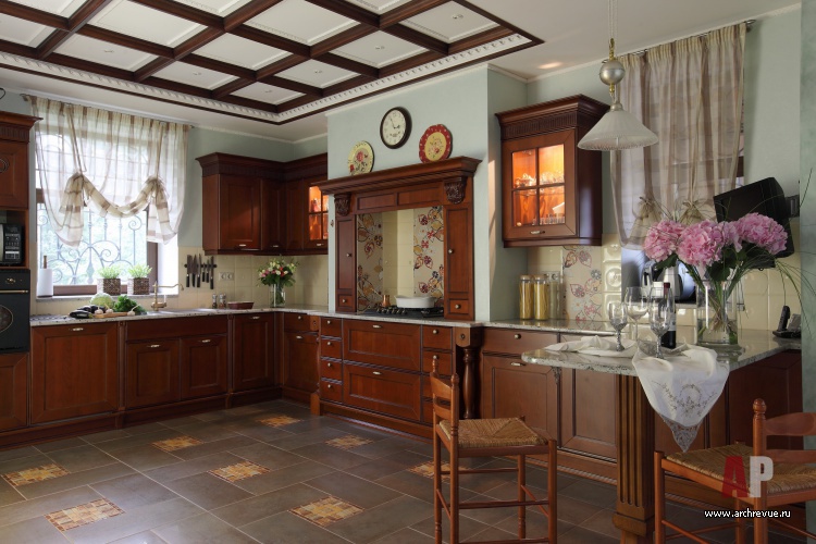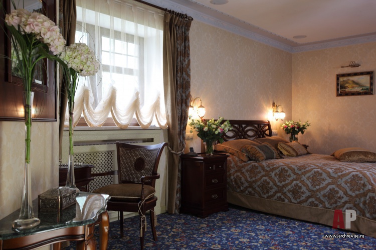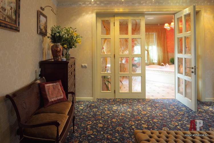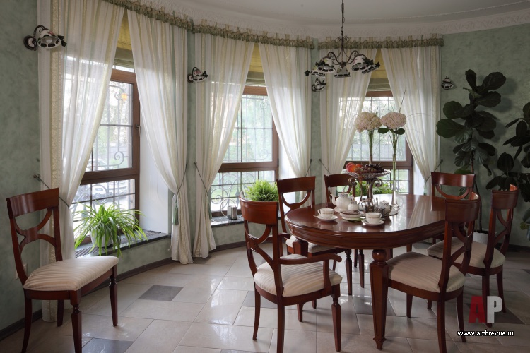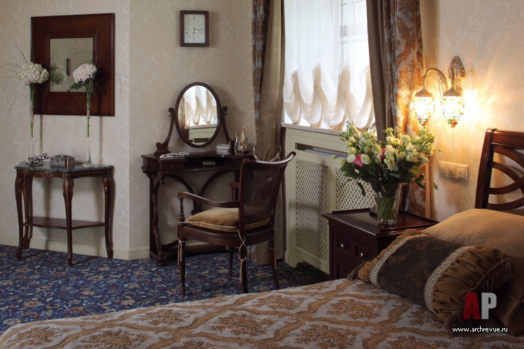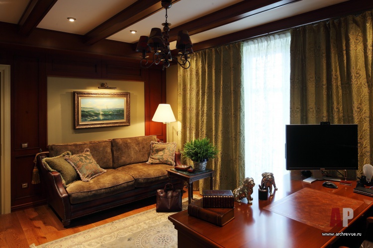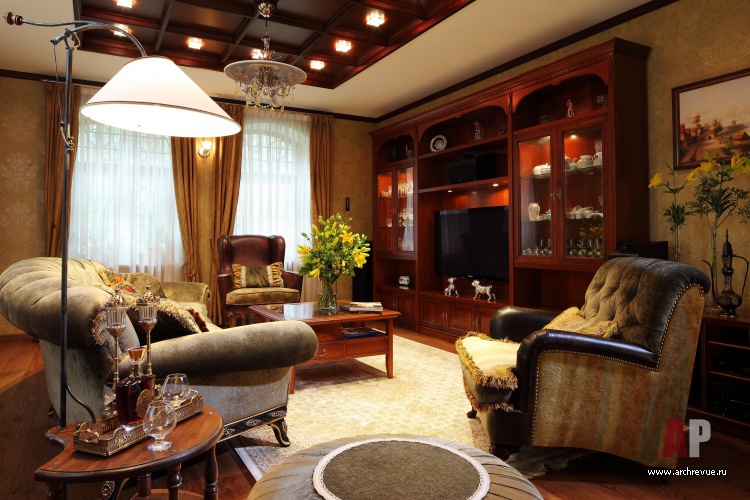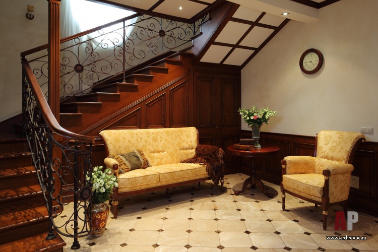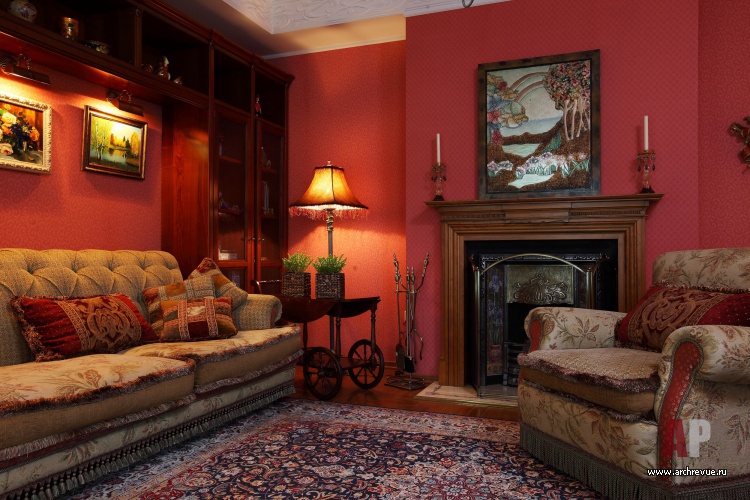 Ведущую партию в интерьере дома играет английская классика: использование деревянных панелей и раскладок на потолках, массивная лестница из дуба, ковровые покрытия с разнообразными рисунками, обои с тиснением, кованые камины – все это отсылает к особнякам викторианской эпохи.
