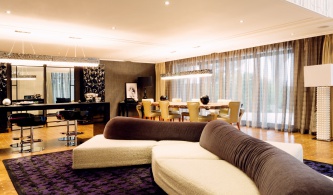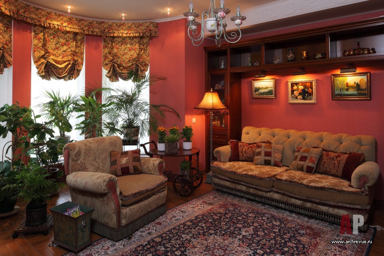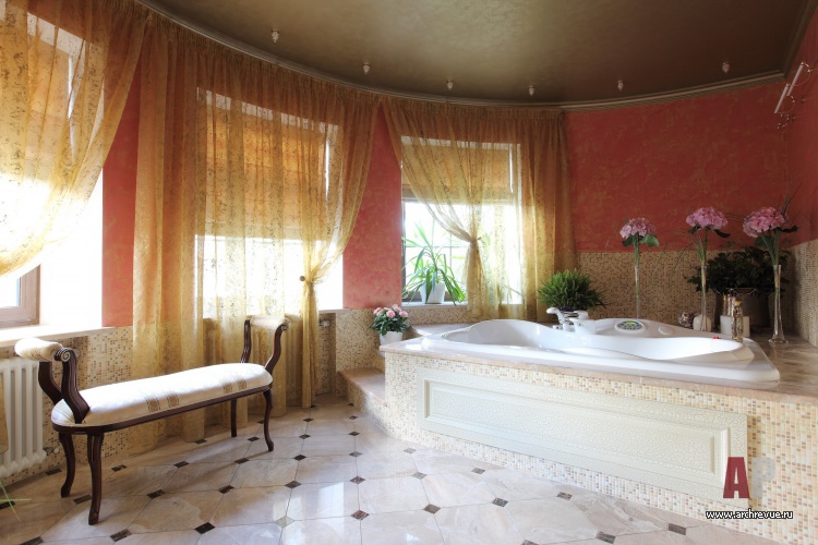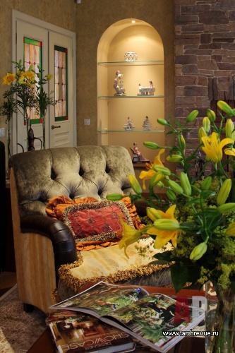 Интерьер выглядит осязаемым и очень уютным за счет темной цветовой гаммы, витиеватой орнаментики, подробному декору и необычайно приятным на ощупь материалам. В их числе: мраморная плитка, природный камень с неровным спилом, обои с тиснением, текстильные обои, многочисленные ковры.