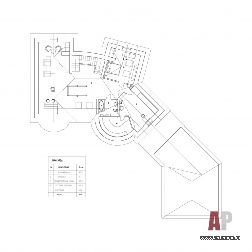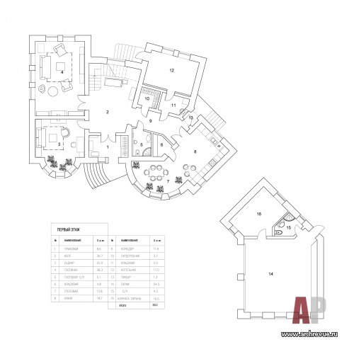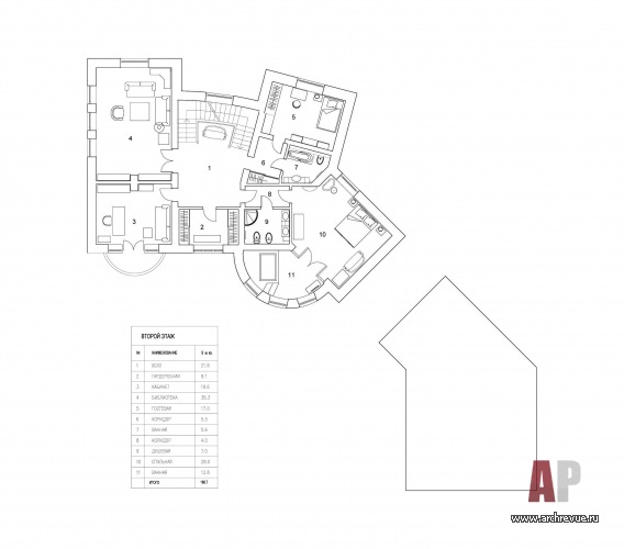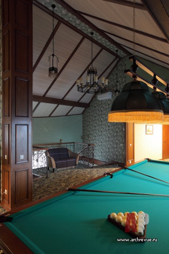 Слева от холла находится гостиная и кабинет- будуар хозяйки – уединенное место для занятия живописью и рукоделием. Вдоль холла спроектированы: гостевой санузел, гардеробная, вход в котельную и дополнительный выход на улицу. Второй этаж занимают приватные помещения хозяев дома: кабинет хозяина, библиотека, спальня с ванной комнатой и хозяйский блок – спальня, душевая и ванная. Мансардный этаж отдан зоне отдыха с бильярдом, барной зоной, мягкими диванами: здесь так приятно собираться всей семьей или с гостями, устраивать праздники и другие мероприятия. Отдельно в мансарде расположена спальня сына, а также хозяйственный блок. Самостоятельным блоком, соединенным с домом только общей крышей, выделен гараж на 2 машины. В нем же находится комната обслуживающего персонала с душевой.