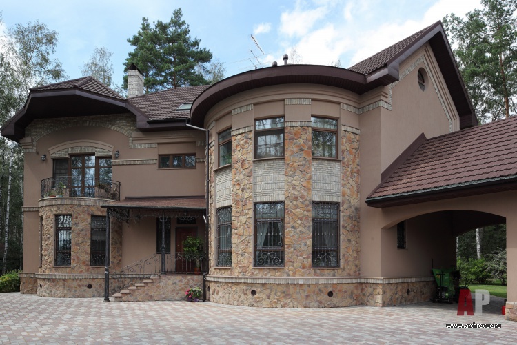 Облицовочные материалы, наружная отделка – полимерная штукатурка BauColor, поставщик «Инбау »; отделка цоколя и декоративные пояса – камень и плитка, поставщик Kamrock