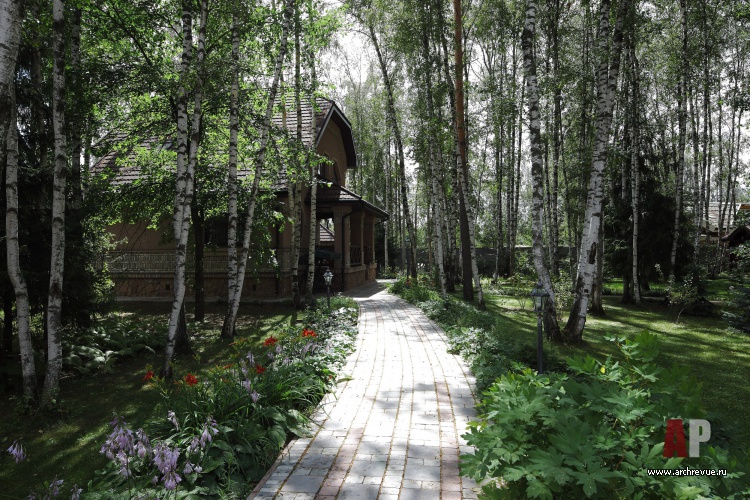Своим объемом он разделяет территорию на регулярную и природную зоны. Кроме основного дома на участке имеются гостевой дом, мастерская, беседка и теплица.