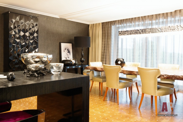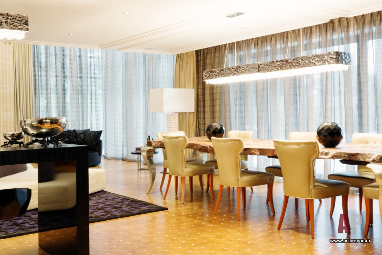 Основным предметом, который объединил пространство, стал модульный диван. Его особая конструкция с центральным упором для спины обеспечивает вариативность размещения, садиться на него можно с любой стороны. Тему роскоши поддерживает обеденный стол из цельного куска ствола дерева, светильники из металла, а также паркет с мраморной инкрустацией.