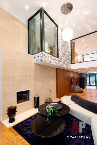 Центральное помещение дома – двусветная гостиная, которая объединила в себе зону отдыха, столовую, барную группу и домашний кинозал. Визуальной частью объема является балкон второго этажа и стеклянный эркер спальни – выносная прозрачная конструкция. Второй уровень занимают личные апартаменты: спальня, две детские, гостевые и кабинет.