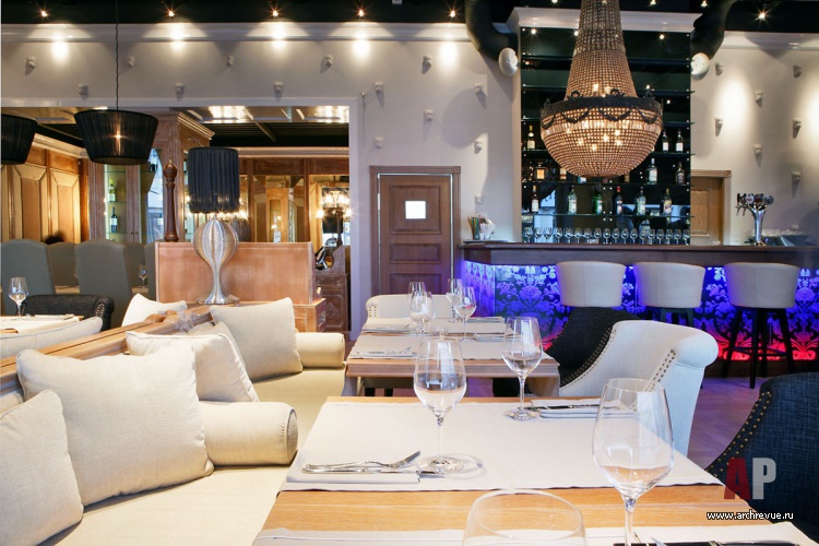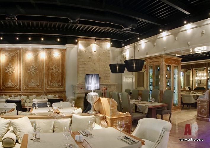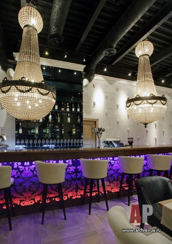 В верхних помещениях архитекторы играли крупными объемами: массивные люстры практически ложатся на барную стойку, высота потолка подчеркнута черным цветом.