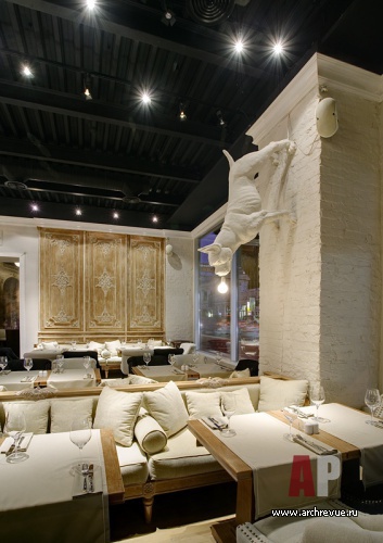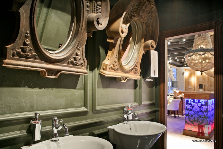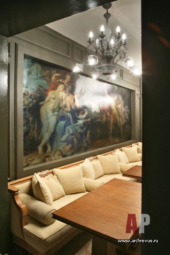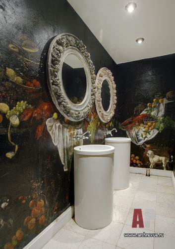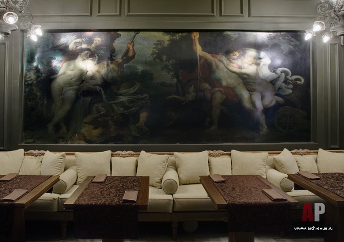 Это и свисающие вниз гипсовые собаки-светильники, и коллаж из картин Рубенса, и роспись стен туалетных комнат, выполненная профессиональным художником, и декоративный камин с лепными «флер де лис», а также круглые столы в виде античных амфор в подвальном этаже.
