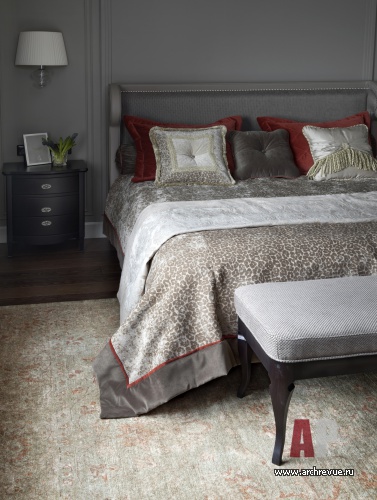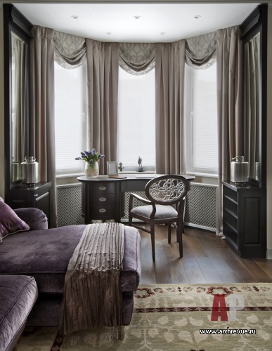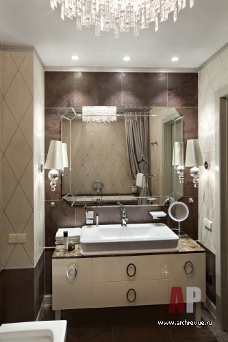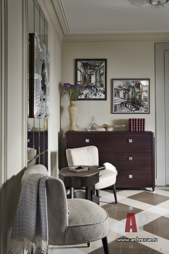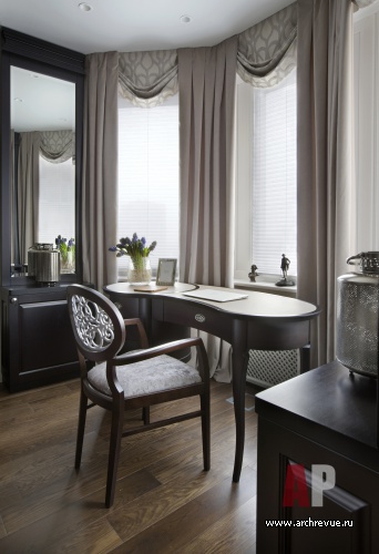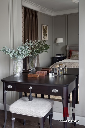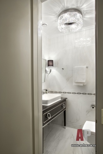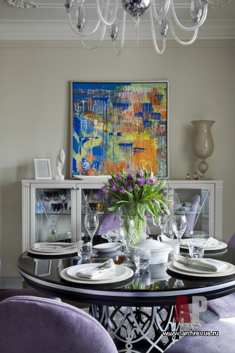 Стилистику интерьера сами авторы проекта определяют как современная классика с элементами ар-деко. Живая и подвижная, где уместно выглядит и традиционная лепнина, и современная живопись. Особое очарование и элегантность интерьеру придает утонченная цветовая гамма.