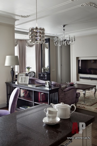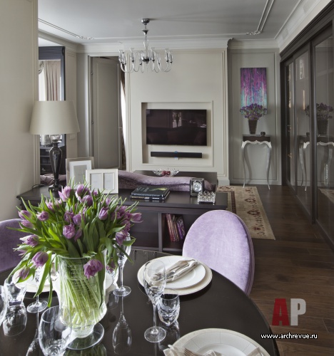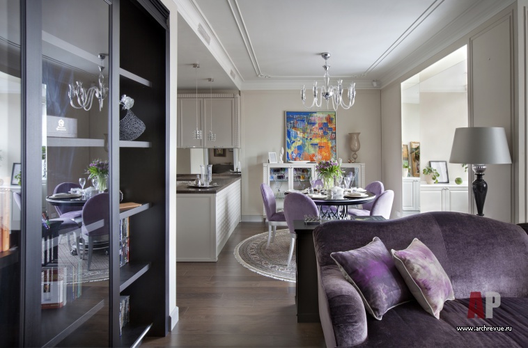 Основной оттенок – сложный бежево-серый, который воспринимается взглядом как холодный бежевый или теплый серый и великолепно оттеняет любимый хозяйкой цвет лаванды. В нем исполнен неоклассический диван, стулья обеденной группы, а также декоративные аксессуары.