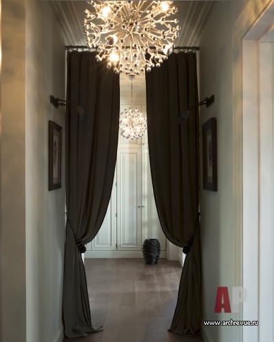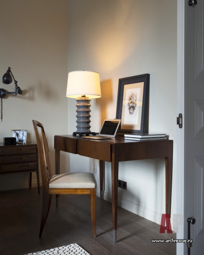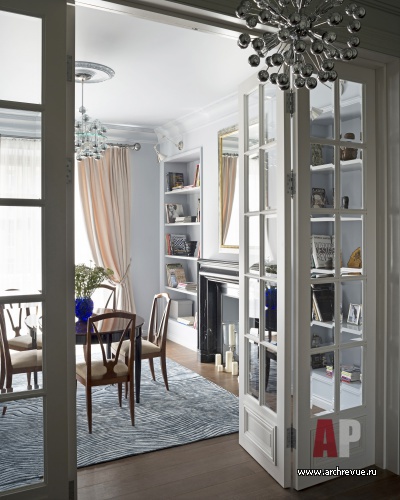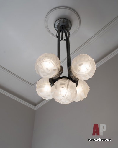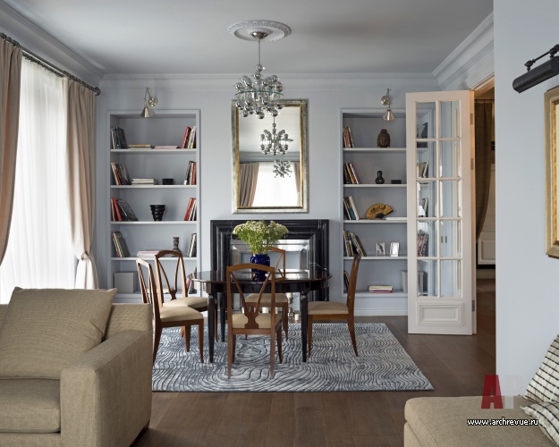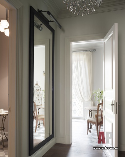 Однотонные стены, дубовый винтажный паркет, привезенный из Италии, лаконичный лепной декор, высокий светлый плинтус и стеклянные с белыми переплетами двери – сама оболочка интерьера выполнена в стиле спокойной классики. Настроение в нем задают детали: винтажные и антикварные люстры-шары, мебель разных десятилетий ХХ века, кропотливо собранных дизайнером по всему митру. В числе предметов есть обеденный стол из красного дерева от Жак-Эмиля Рульмана и туалетный столик от Джо Понти.