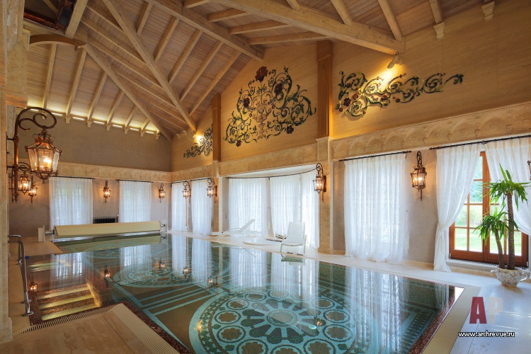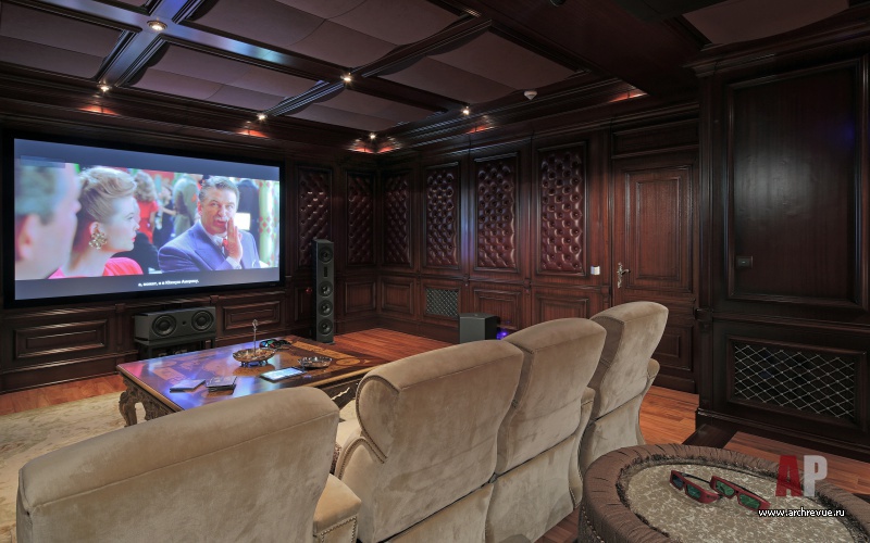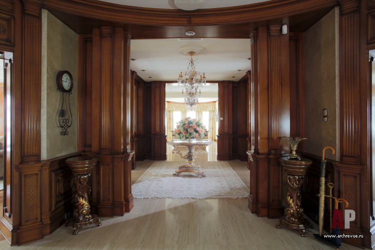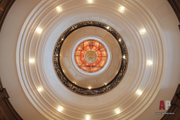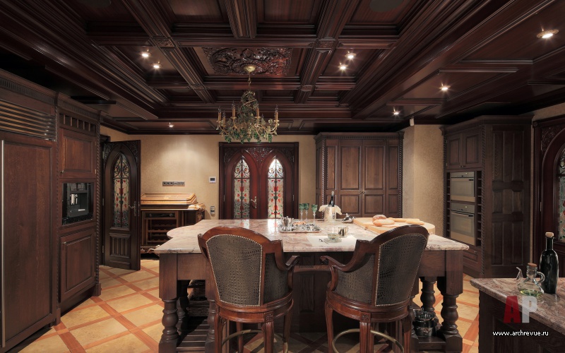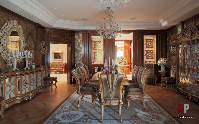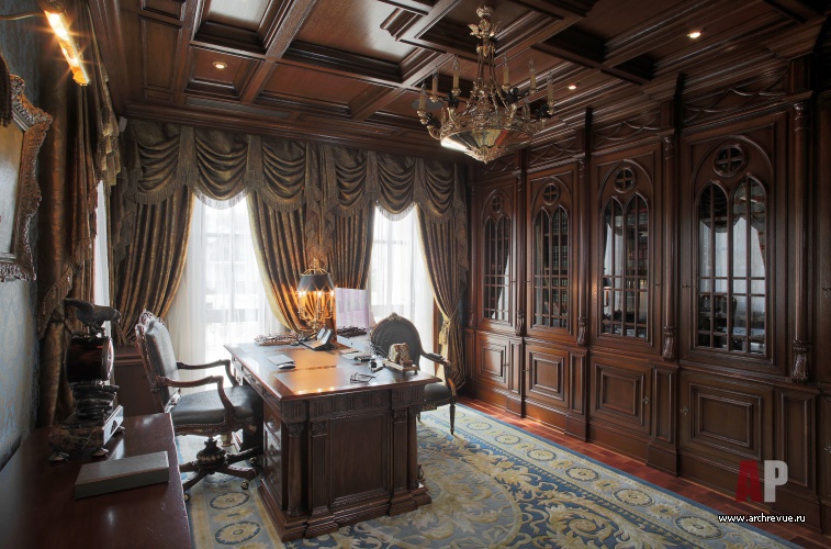 Работа над проектом велась исключительно декораторскими средствами. Роскошный декор с пышной лепниной, авторскими витражами, прихотливой ковкой в оформлении лестничных холлов, обоями ручной работы, резным камнем, скульптурными коврами сочетается с темным деревом – материалом, традиционным для английской классики.