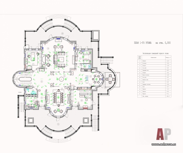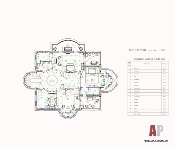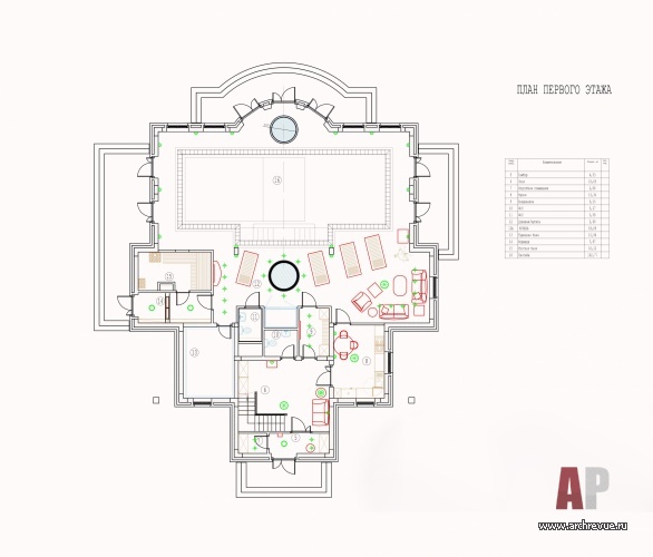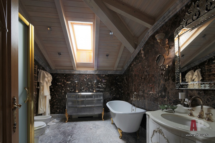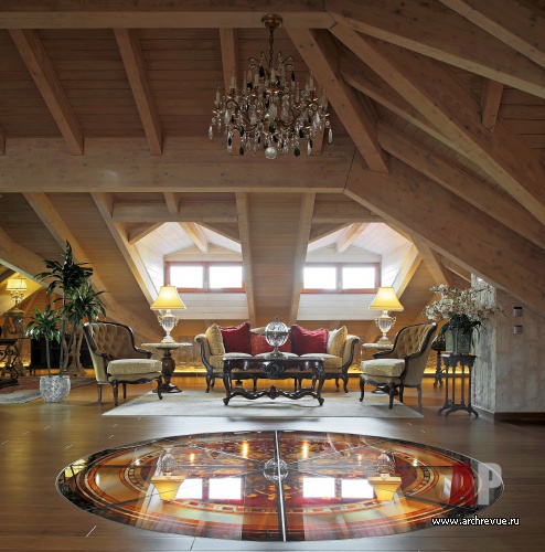 Пространство особняка организовано на трех уровнях: нижний – гостевой, верхний – приватный, а третий, мансардный, с ломаной подшитой деревом кровлей – зона отдыха и развлечений. В отдельной двухэтажной пристройке располагается бассейн и домашний SPA-комплекс. В цоколе размещен винный погреб и домашний кинозал.