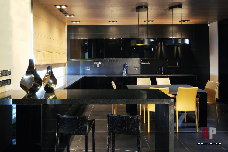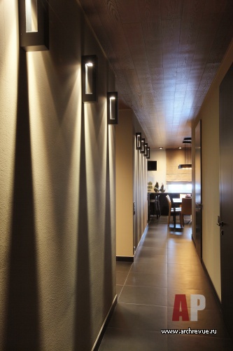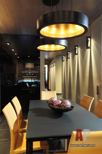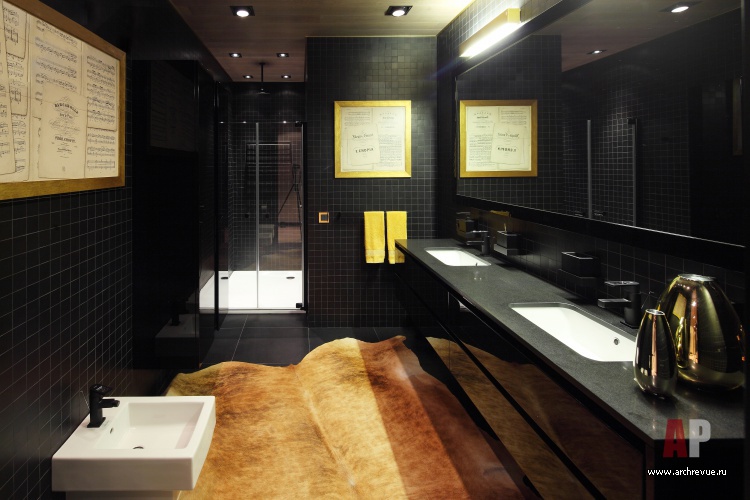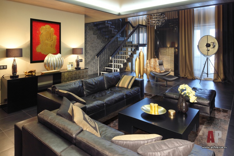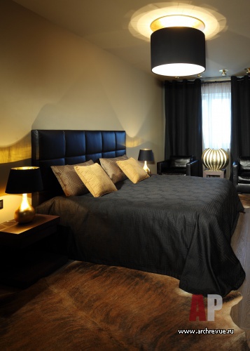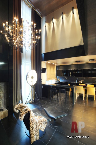 Особое внимание архитекторы уделили световому оснащению квартиры: они разработали разные световые сценарии и организовали интересное локальное освещение. Оно в нужном свете демонстрирует живописные работы и выгодно подчеркивает пластику пространства. Плотную темную гамму разбавляют теплые золотисто-охристые тона, а также ковры из шкур.
