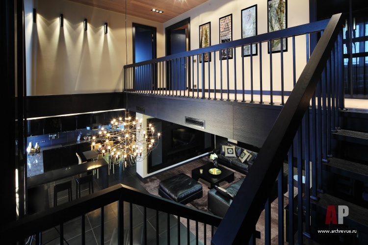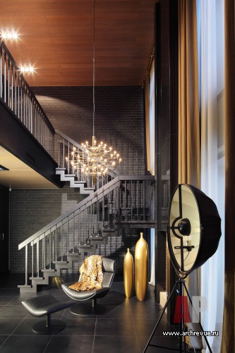 Структура квартиры напоминает загородный дом. Большая высота и внушительная площадь позволили создать в ней два полноценных этажах с двухсветной гостиной и камином. Первый уровень по традиции занимают общественные помещения, спроектированные по принципу открытых перетекающих пространств. Второй уровень – приватные апартаменты.