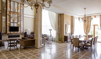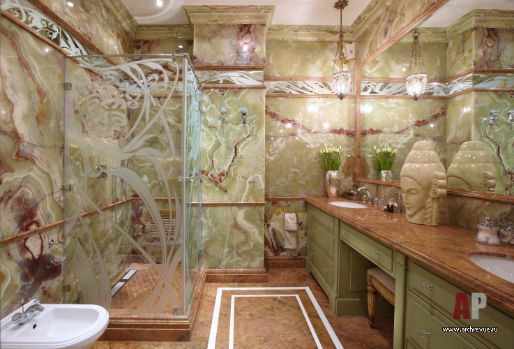 Из общего ряда выделяется оформление приватных помещений: классического по духу кабинета, хозяйской ванной комнаты, стены и пол которой покрыты зеленым ониксом и исполненной в унисон ей спальни в золотисто-зеленых тонах.