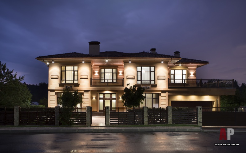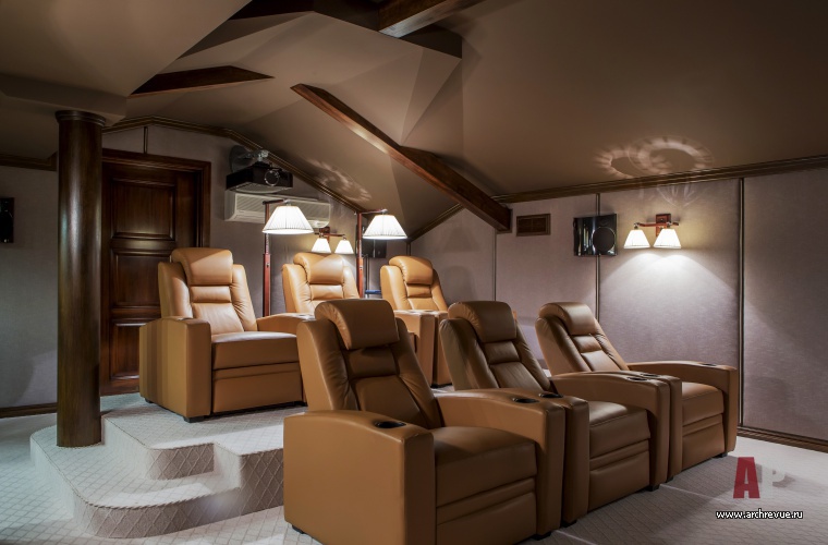 Двухэтажный дом имеет традиционную планировку: нижний уровень занимают общественные помещения. Их смысловым центром служит двухсветная гостиная с камином, чей портал оформлен семиметровым художественным витражом. Верхний уровень занимают апартаменты хозяев со своими ванными и гардеробными. В мансарде под скосом кровли находится домашний кинотеатр, в цоколе расположен бассейн и технически помещения.