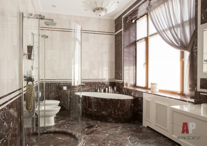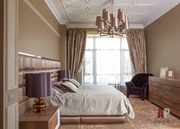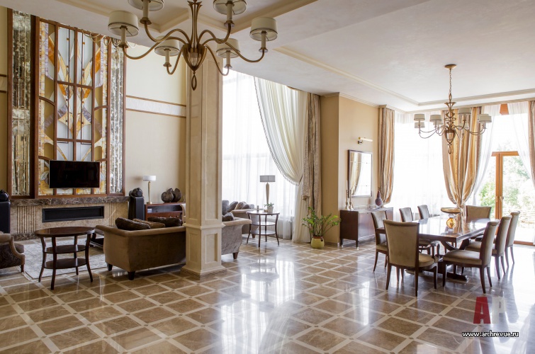 Когда архитекторы подключились к проекту, ряд отделочных материалов уже был закуплен (роскошный мрамор нескольких сортов, паркетная доска из груши), начата работа со столярами, каменщиками, строителями. Ключом к образу дома стала неоклассическая мебель: от помещения к помещению ее настроение меняется. Если в гостиной ставка сделана на американскую классику, то в спальнях присутствуют черты ар-деко.