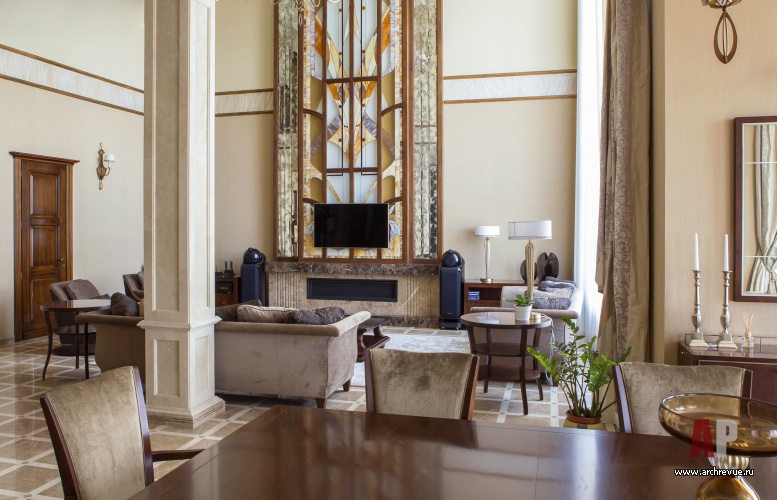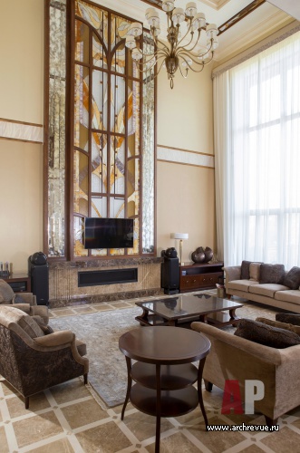 Декоративная доминанта дома, его визитка – роскошный вертикальный витраж, который служит и порталом камина, и мощным светильником, и художественным элементом, который задает общую декоративную тональность. Исполненный в теплых янтарных тонах витраж возник на месте окна, которое следовало скрыть и декоративно обыграть.