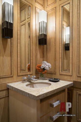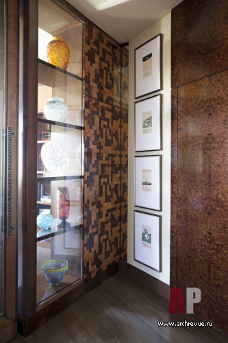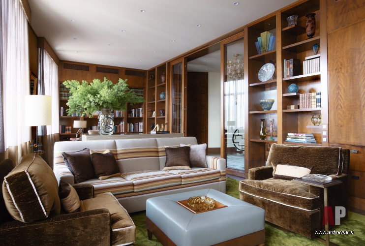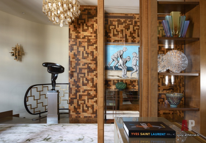 Интерьер гостиной оформлен в дымчато-коричневатой гамме, стены зашиты панелями из корня американского ореха. В декоре холла второго этажа использован еще более выразительный материал: панели из ценных пород дерева с шахматным рисунком в технике маркетри.