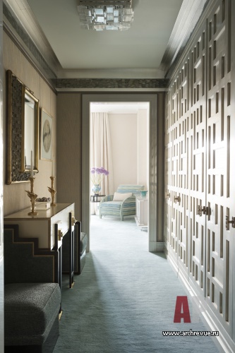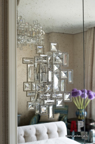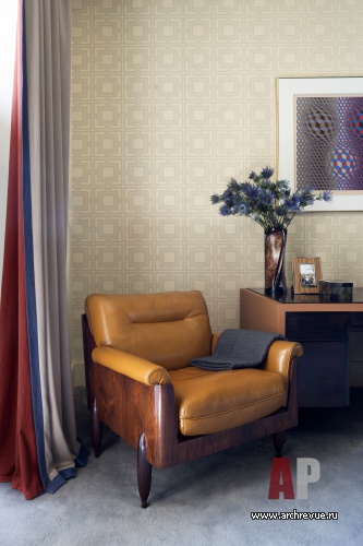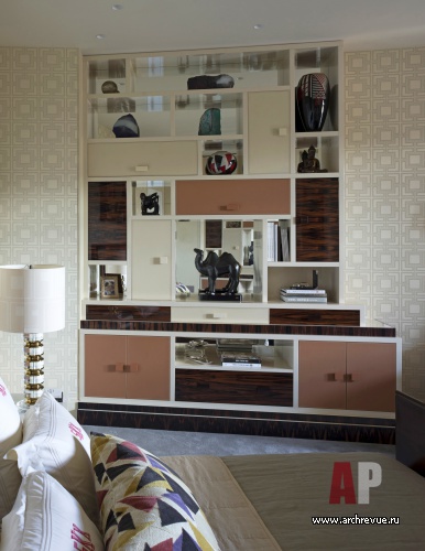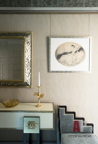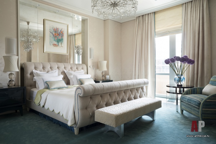 В спальнях выбор сделан в пользу кремово-пудровых тканей: использование одних и те же материалов в оформлении стен и окон зрительно расширяет пространство, наполняет его воздухом. Авторская мебель, зеркала, ткани нетривиальных расцветок, а также хозяйская коллекция антикварного стекла Lalique и живописи музейного уровня придают интерьеру уникальное звучание.