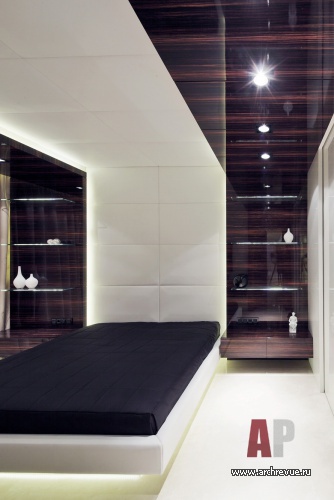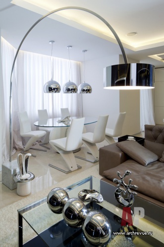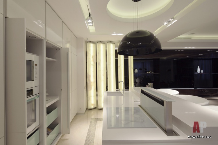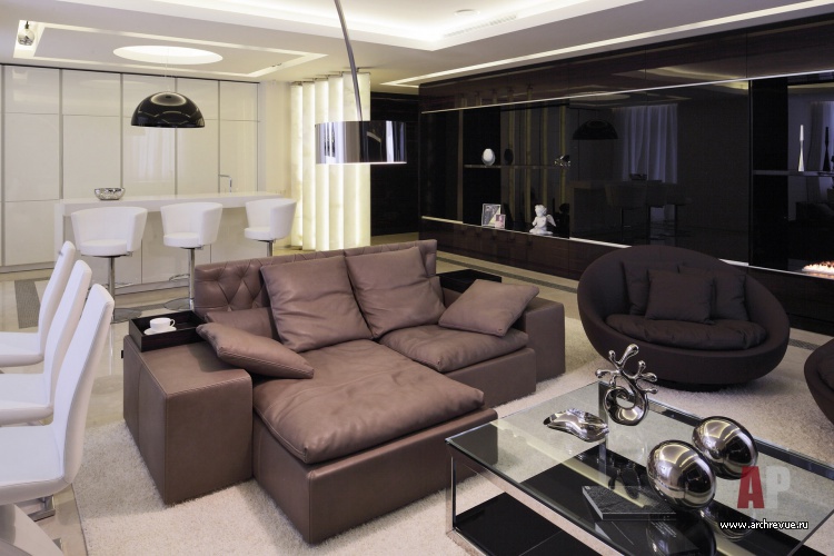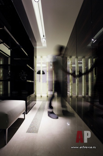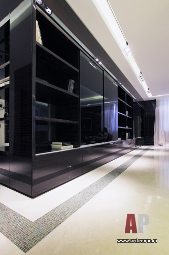 Работая над проектом, архитекторы практически сразу дали ему название «Темный шоколад» из-за обилия изделий из лакированного шпона макасара, выполненных на заказ в московской столярной компании. Уйти от монотонности в большом объеме позволила комбинация плоскостей из материалов разных цветов и фактуры: белого глянца (фасад кухни), оникса (вращающаяся перегородка), бежевого каменного пола.