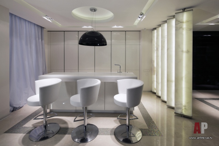 Центральное место в квартире занимает студийное помещение гостиной, столовой и кухни. Близкая заказчикам идея открытого пространства позволила избежать глухих перегородок и дробного зонирования. Кухню и прихожую отделяет «ширма» из вращающихся панелей оникса.