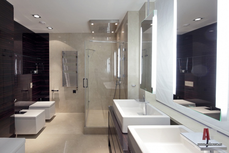 Приватные помещения выделены в отдельный блок и занимают все правое крыло вытянутой в плане квартиры. Они включают в себя две спальни со своими ванными комнатами и гардеробными.