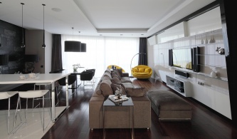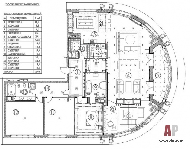 Квартира расположена в доме с полукруглой конфигурацией фасадов. Обтекаемая пластика, открытые объемы, большие окна продиктовали современную планировку. Общественная и приватная зоны разделены и разнесены в разные части пространства. Спальня хозяев и детские расположены в своем крыле, а гостевые помещения объединены в общий блок.