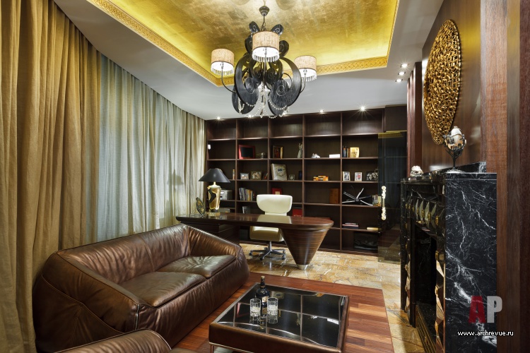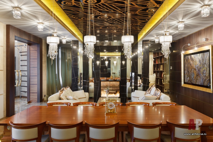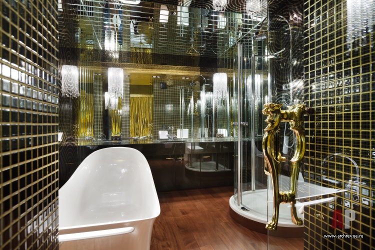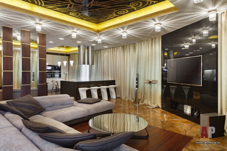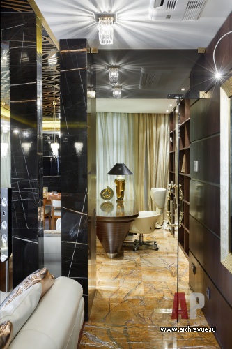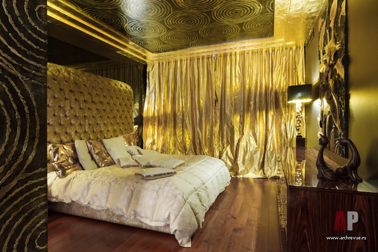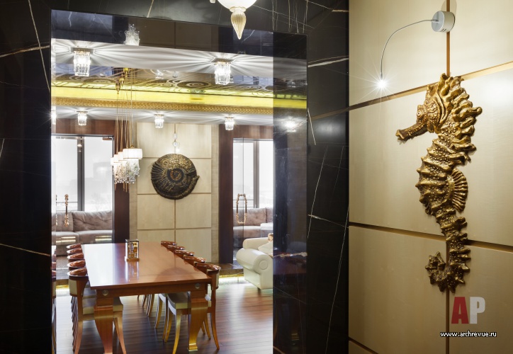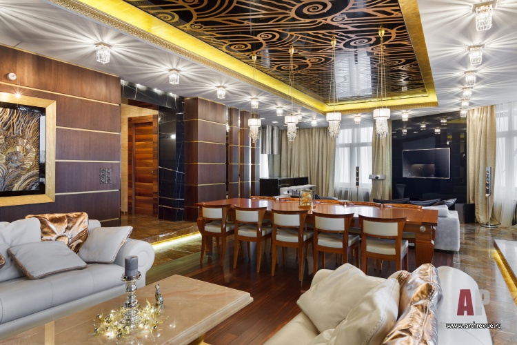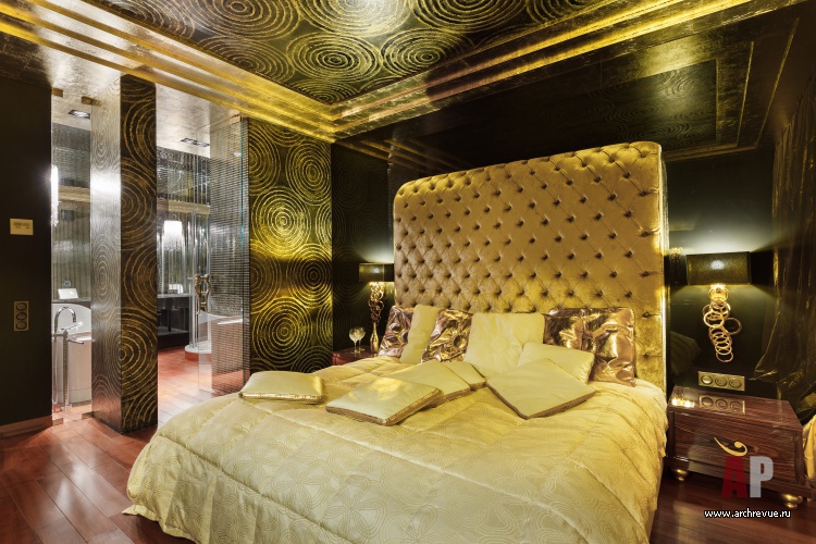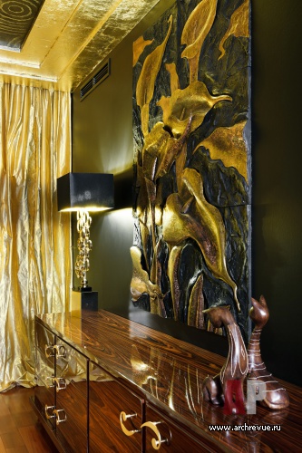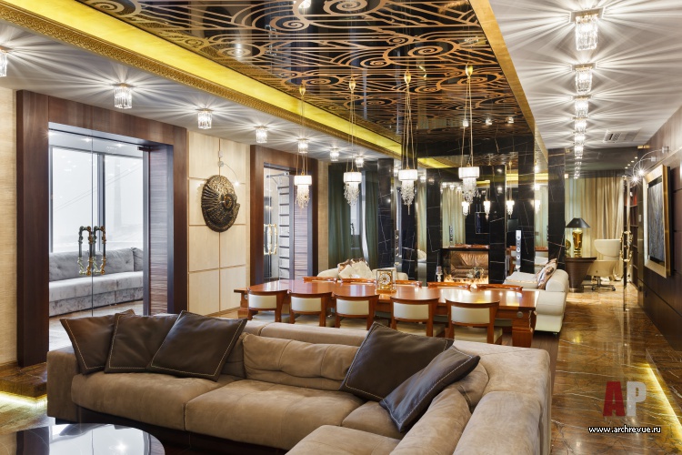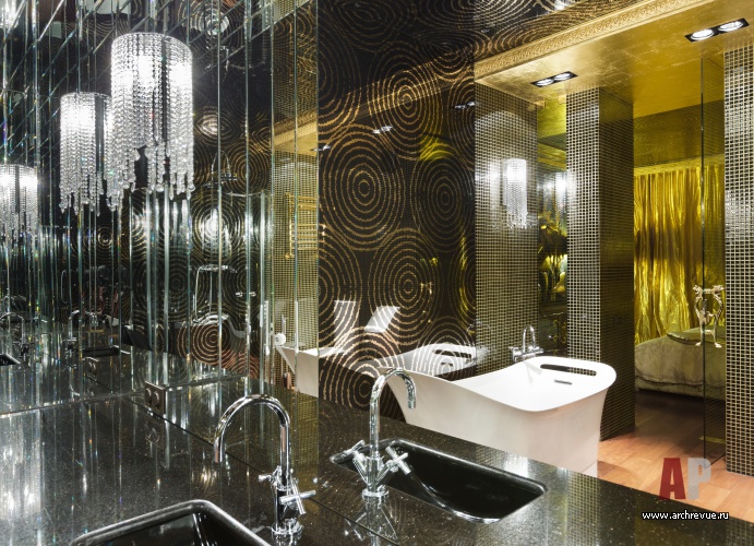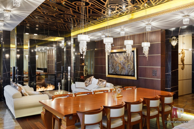 Черный мрамор с белыми прожилками ( облицовка перегородок), медовый камень (отделка пола), созданные вручную фактурные покрытия, авторские росписи, броские предметы мебели, авторские аксессуары (панно из металла, дверные ручки), двери и панели из ореха с необычным природным рисунком. Но особого внимания заслуживают потолочные и стеновые покрытия, украшенные стилизованными под ар-деко мотивами и покрытые сусальным золотом. Они создают яркое, праздничное настроение.