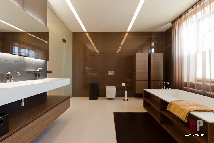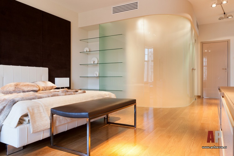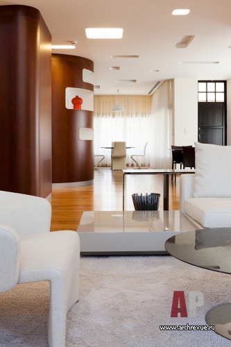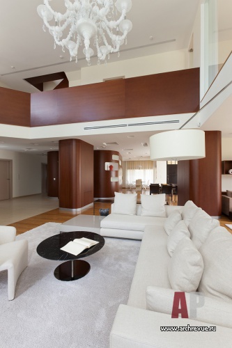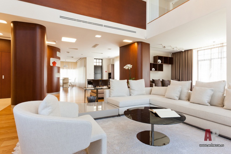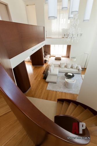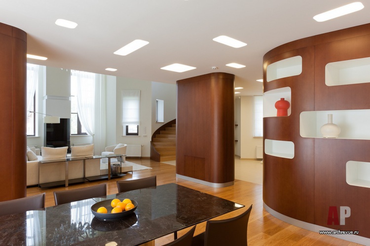 Современный по смыслу интерьер строится на сочетании двух цветов: белого и натурального цвета древесины ореха: теплого и солнечного. Использование древесины ореха в качестве обшивки гнутых стен первого этажа, ограждения винтообразной лестницы, буазери в приватных помещениях – намек на классическую составляющую интерьера.