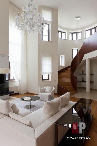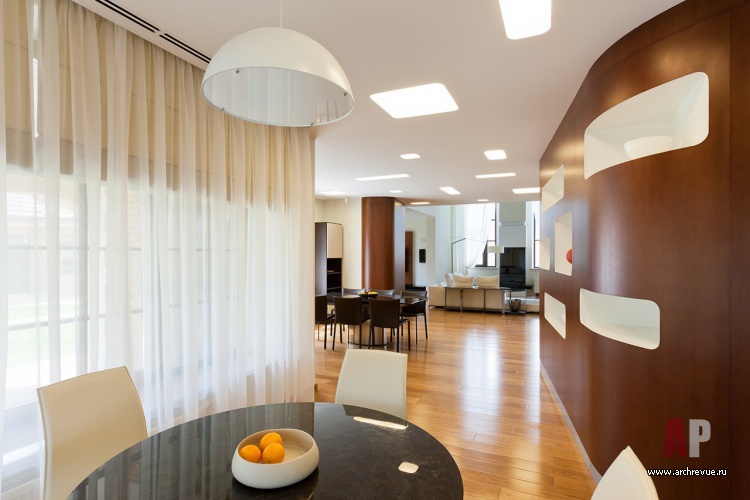 Характерная особенность трехэтажного особняка – пластичная архитектура с максимально открытыми объемами. Чтобы визуально обособить разные по назначению зоны, внутри двухэтажной гостиной архитекторы выстроили три округлых объема, обшитых древесиной ореха. Они обеспечивают плавное перетекание одного пространства в другое.
