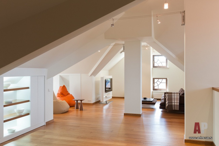 Самый большой из них (в нем находятся гостевой санузел, гардеробная и кладовая) раскрывается на три стороны и связывает блоки прихожей, кухни и столовой, а также отделяет кухню-столовую от двусветной гостиной. Второй этаж представлен связкой спальни-кабинет с сопутствующими помещениями. Верхний, мансардный этаж занимает зона отдыха и гостевые помещения.