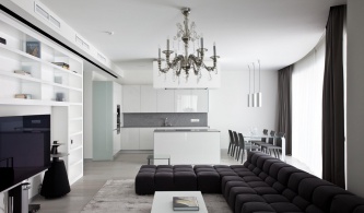 Для молодой семейной пары с ребенком дизайнер Варвара Шабельникова создала эклектичную квартиру в прохладных жемчужно-бирюзовых тонах. Интерьер необычайно свежий, легкий и воздушный. Важное внимание она уделила подбору обивочных и драпировочных тканей, их цветовой палитре и орнаменту.
