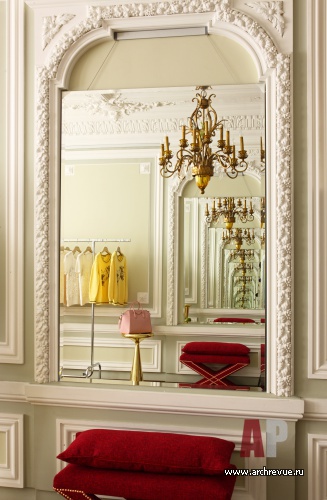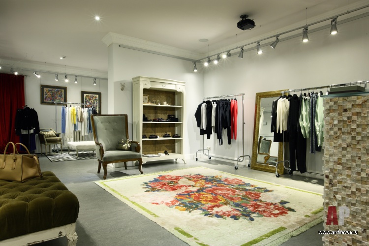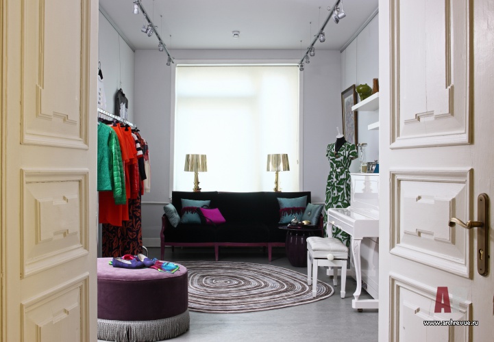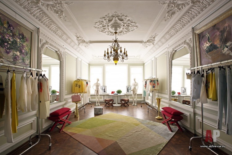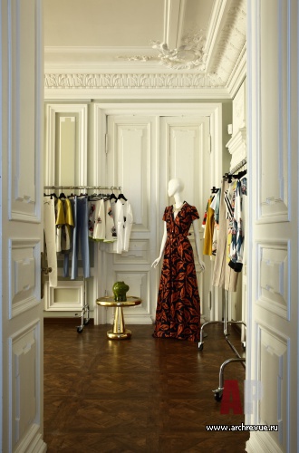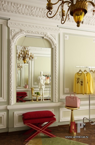 Дизайнер Марина Брагинская оформила бутик одежды в историческом особняке вблизи Патриарших прудов. «Исходная ситуация была впечатляющая, - рассказывает автор проекта. – Высокие потолки с чудом сохранившейся великолепной лепниной, величественные двустворчатые распашные двери, планировка с перетекающими помещениями – не использовать такие преимущества было бы непростительной ошибкой».